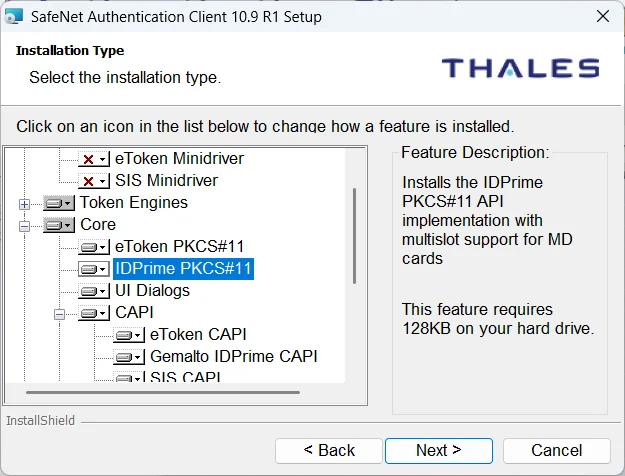 - When installing the software, use the "Custom" installation mode, and ensure the IDPrime PKCS11 driver is installed: